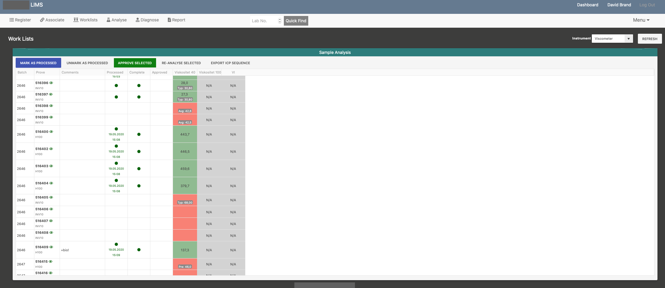 Lab technicians are provided with multiple screens to manage their work. Digital Work Lists allow analysis to be managed by instrument or lab station and to quickly see (via colour coding) which samples require processing, which need review and approval of uploaded results and any re-testing that is required. It is also possible to see an expected or typical result to determine sample volumes or select correct viscosity tubes (for example).