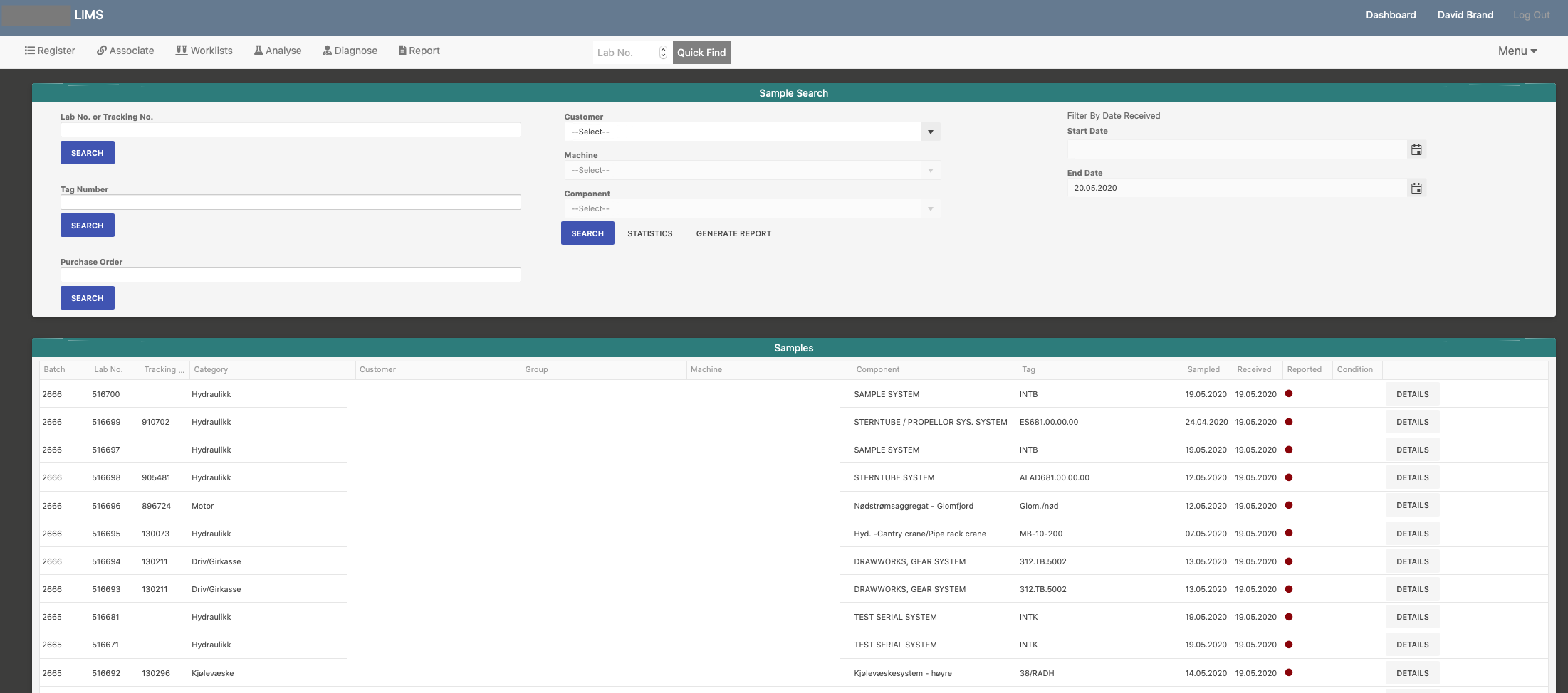 A dedicated Associate screen is provided for data entry staff to quickly find the customer, machine and compartment (or sample point) relating to the sample and add information such as machine hours, oil changes and other relevant information. This screen includes highly responsive search functions and quick access to add or edit missing or changed information. If the sample has been registered online by a customer, this information will be pre-filled and will only need to be quickly checked and approved.
